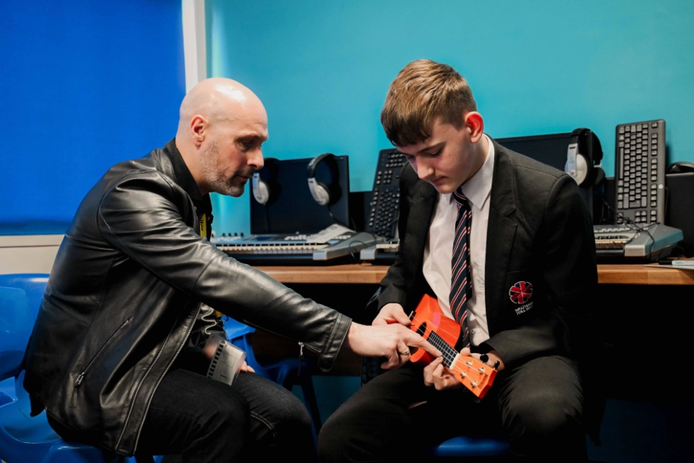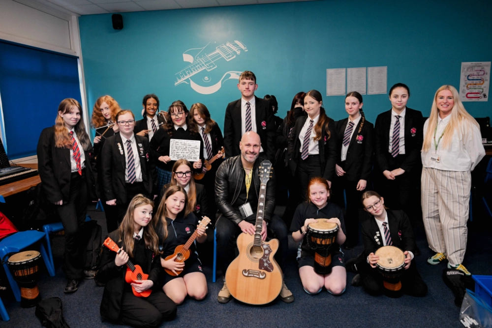 Cleethorpes musician Greg Webb, who has toured the world playing the music of The Eagles, at Waltham Toll Bar Academy’s Careers Week. On the right is Careers Lead Laura Fuller, who organised the event.